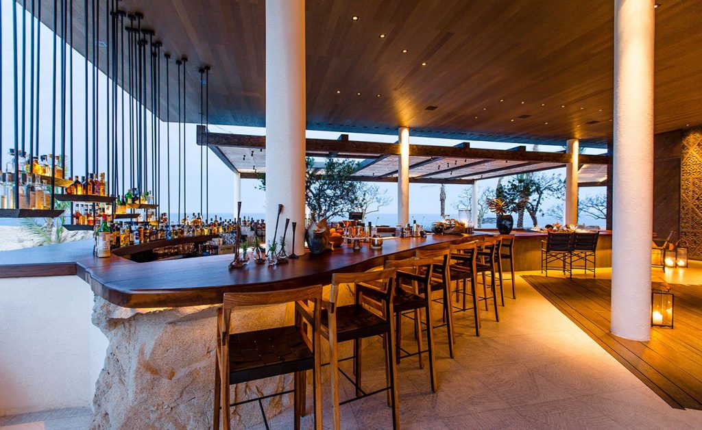 El restaurante, diseñado por Gulla Jonsdottir, está ubicado bajo un cielo abierto, decorado con sillas colgantes, y una exhibición flotante de tequila, que se dice, es la colección tequilera más grande y diversa en Los Cabios.
